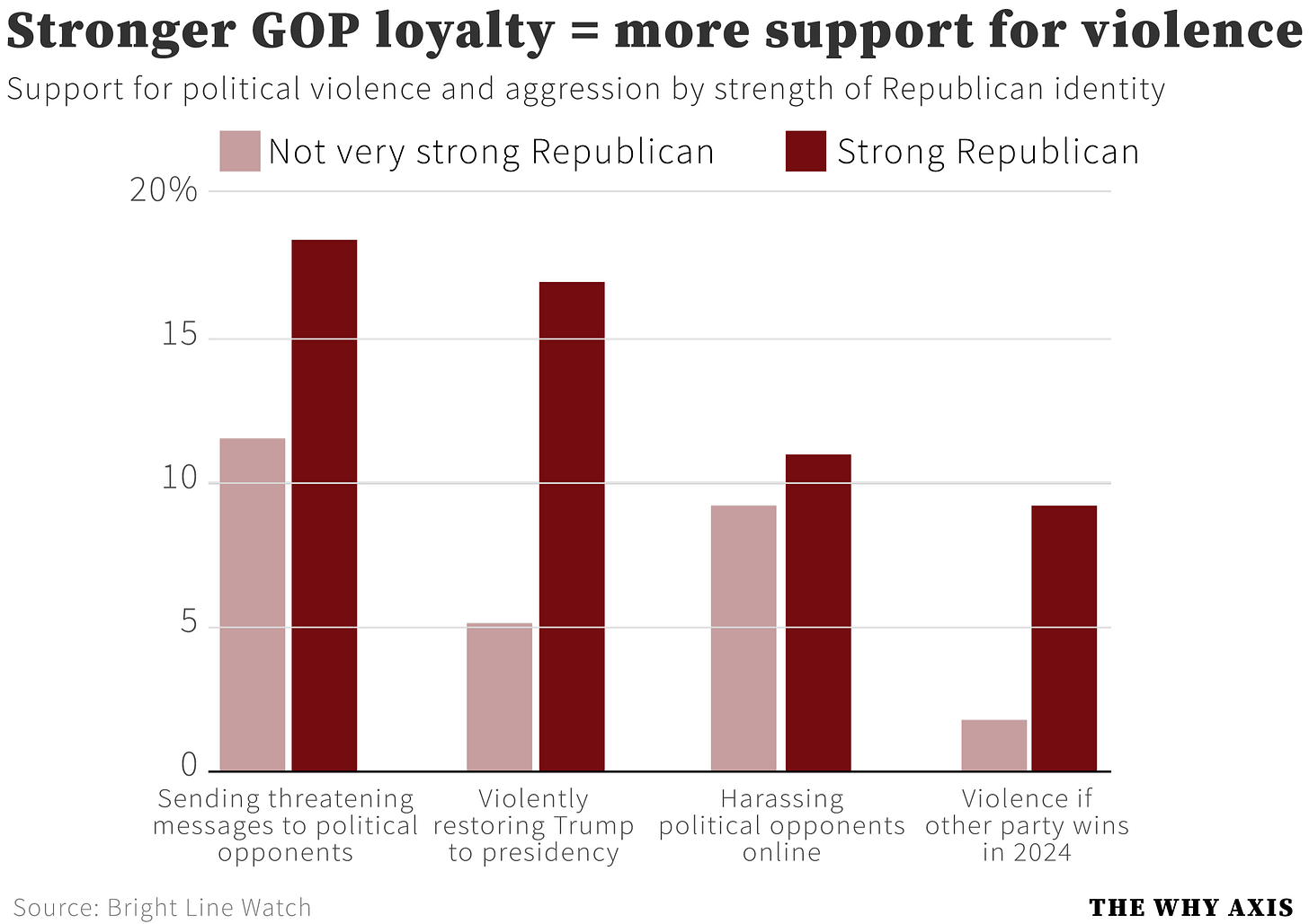 So a group of academic political scientists with Bright Line Watch, a watchdog that measures public attitudes toward democracy, recently ran a survey experiment attempting to suss out support for political violence in its most narrow and concrete form. They polled support for specific acts of aggression and violence, like reinstating Donald Trump via a violent coup. They tailored response options in order to more accurately differentiate between people who actively support violence and those who are simply ambivalent about it. And they also screened respondents based on their attentiveness to the survey, as inattentive survey responders appear to endorse violence at an unusually high rate, suggesting they’re just clicking through rapidly and saying “yes” to everything.