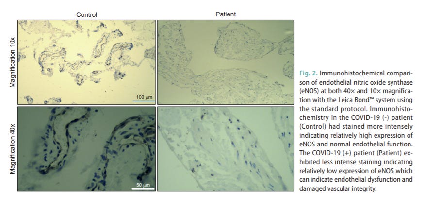 Here’s a microscopic look at the damage in question. The two tissue samples on the left are from patients with no history of Covid. The ones on the right are from Covid patients, and you’ll notice the pigment is lighter in those images. According to the authors, that’s a tell-tale sign of damage to the vessels in the peen.