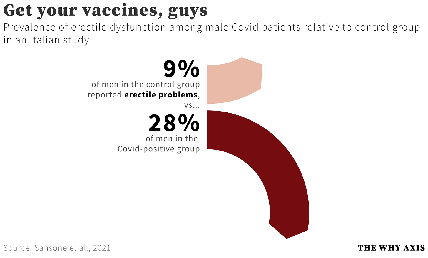 Another paper, published in March, finds some very preliminary evidence that impotence is much more widespread among male Covid survivors than among men with no Covid history. The study examined self-reported responses to a survey administered in Italy in April 2020. The respondents included 25 sexually active men who reported receiving a positive Covid test. The authors compared that cohort to a group of 75 non-patients who were otherwise similar in terms of sexual activity, age, BMI, and mental and physical health.
