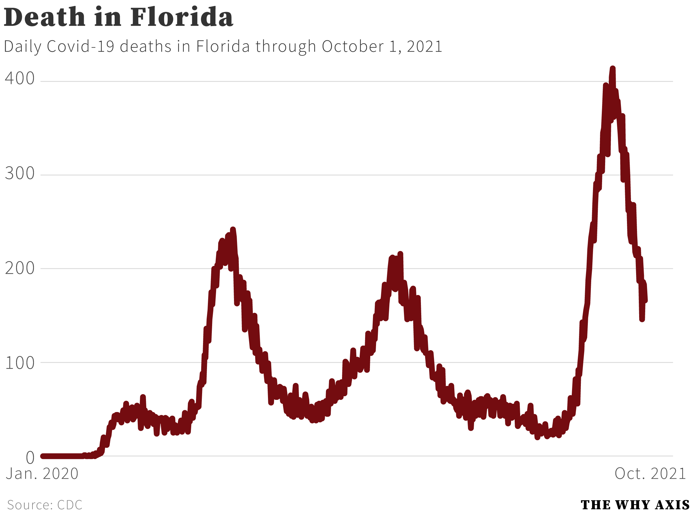 Cases are low right now in Florida simply because the Delta wave burned through the state, virtually uncontrolled, earlier in Florida than elsewhere. But what these arguments elide is that the state’s Delta outbreak was the worst in the country, due in large part to DeSantis’ refusal to support bare minimum mitigation measures.