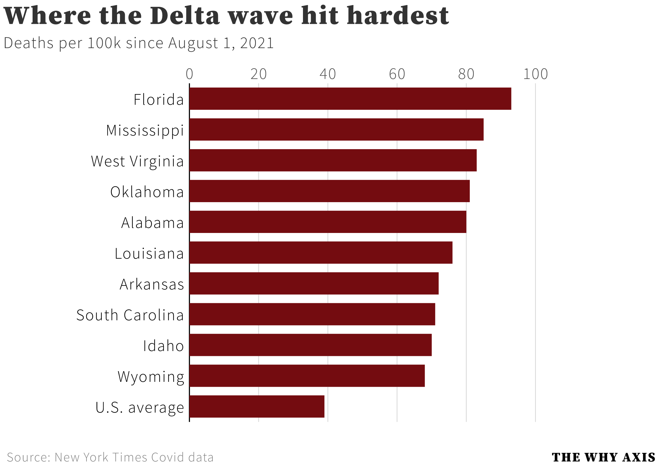 You can roughly peg the start of the Delta death wave to August 1. Since then, Florida’s lost over 20,000 people to Covid — nearly one third of its total pandemic death total. Looking nationwide, no other state comes close to Florida in terms of Delta wave mortality — the rate in Florida is 93 deaths per 100,000, compared to a nationwide average of 39 per 100k (again, these figures only calculate death since August 1).
