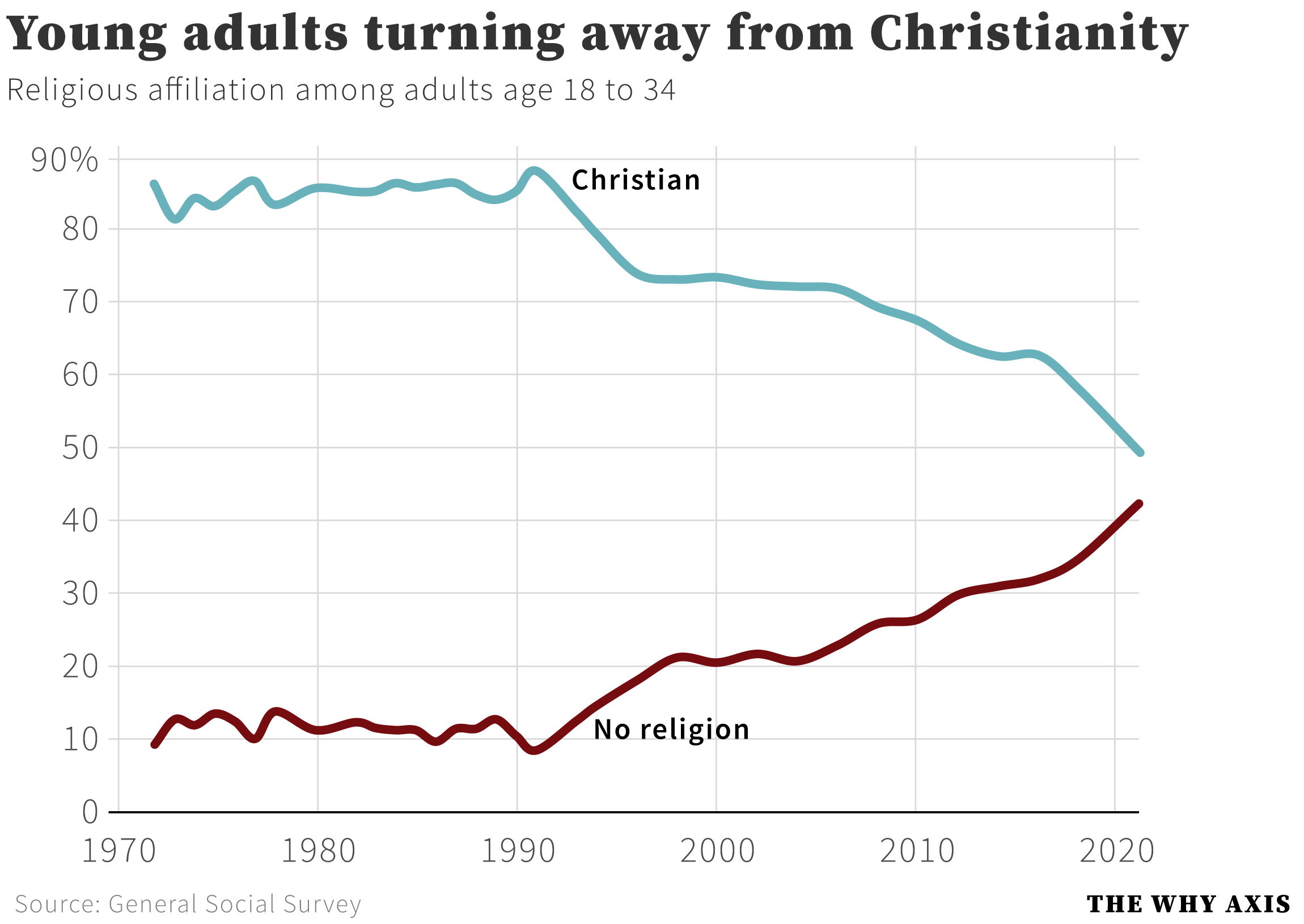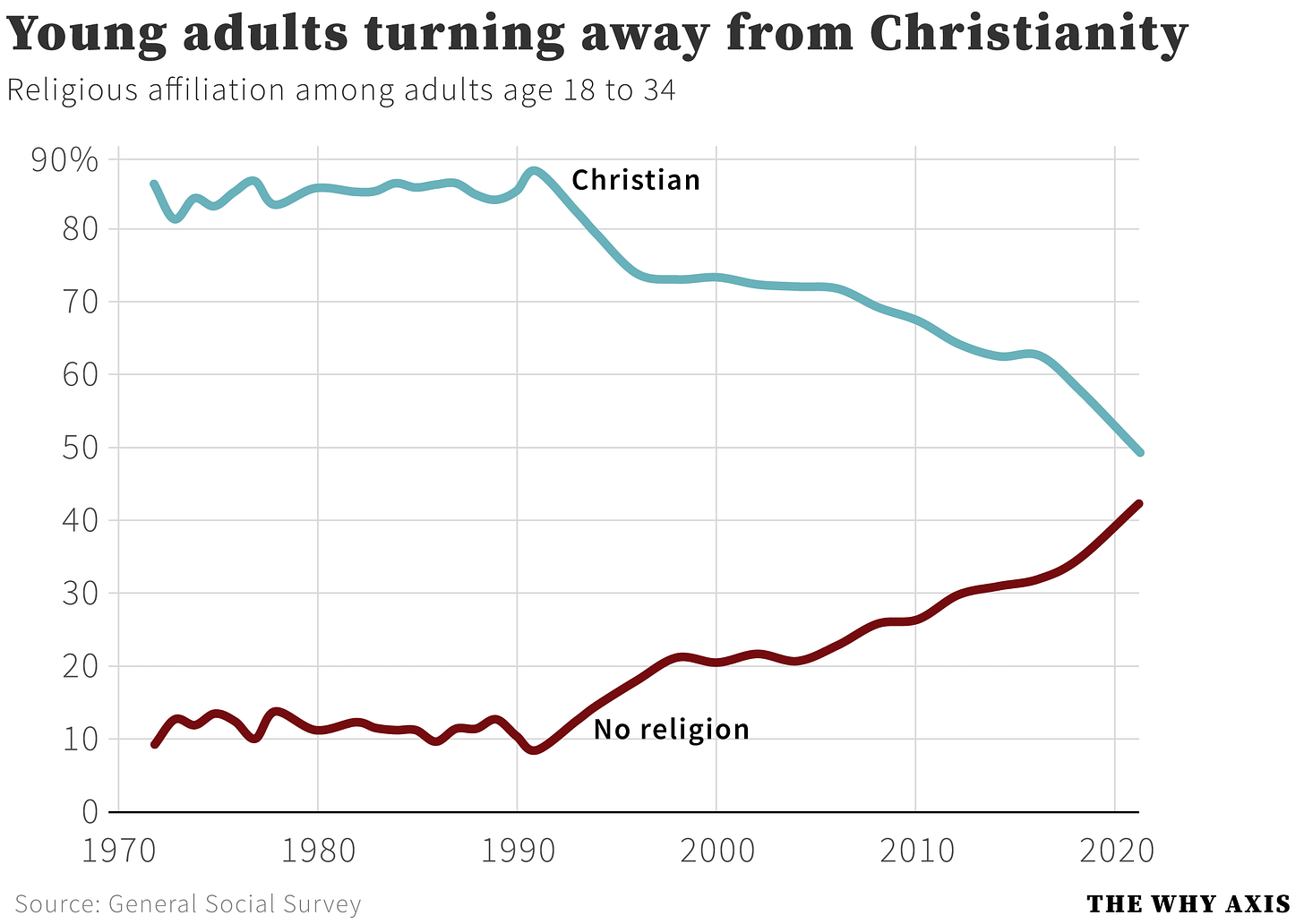 Note that this chart has a longer time horizon, going back to the 1970s. And until the 1990s, religious belief was basically stable — Christians outnumbered non-believers by close to 10-to-1. But the early 90s were a sharp inflection point, setting faith and doubt on the trajectory they’re continuing to this day. I’m not sure what’s behind that, exactly. If you have any ideas, let me know in the comments.