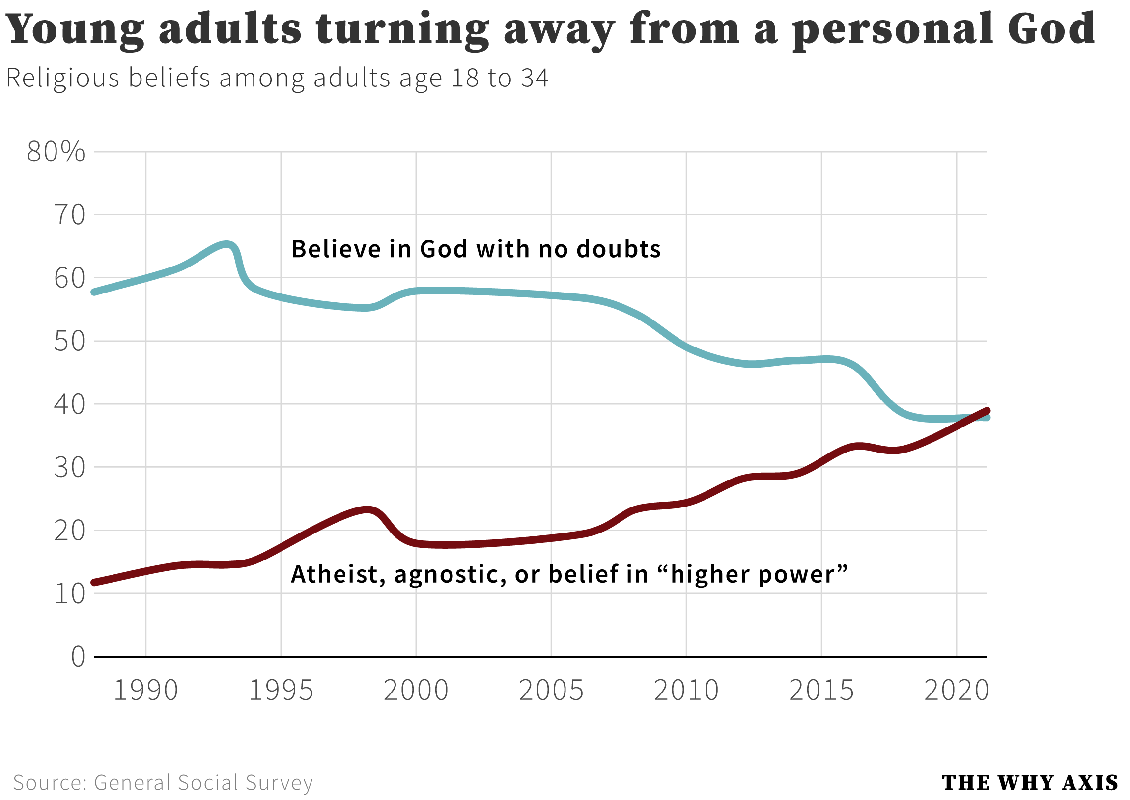 Here’s another striking fact: adults under 34 years of age are, for the first time, more likely to be an atheist, agnostic, or believer in an unspecified higher power than they are to have full confidence in the existence of God.