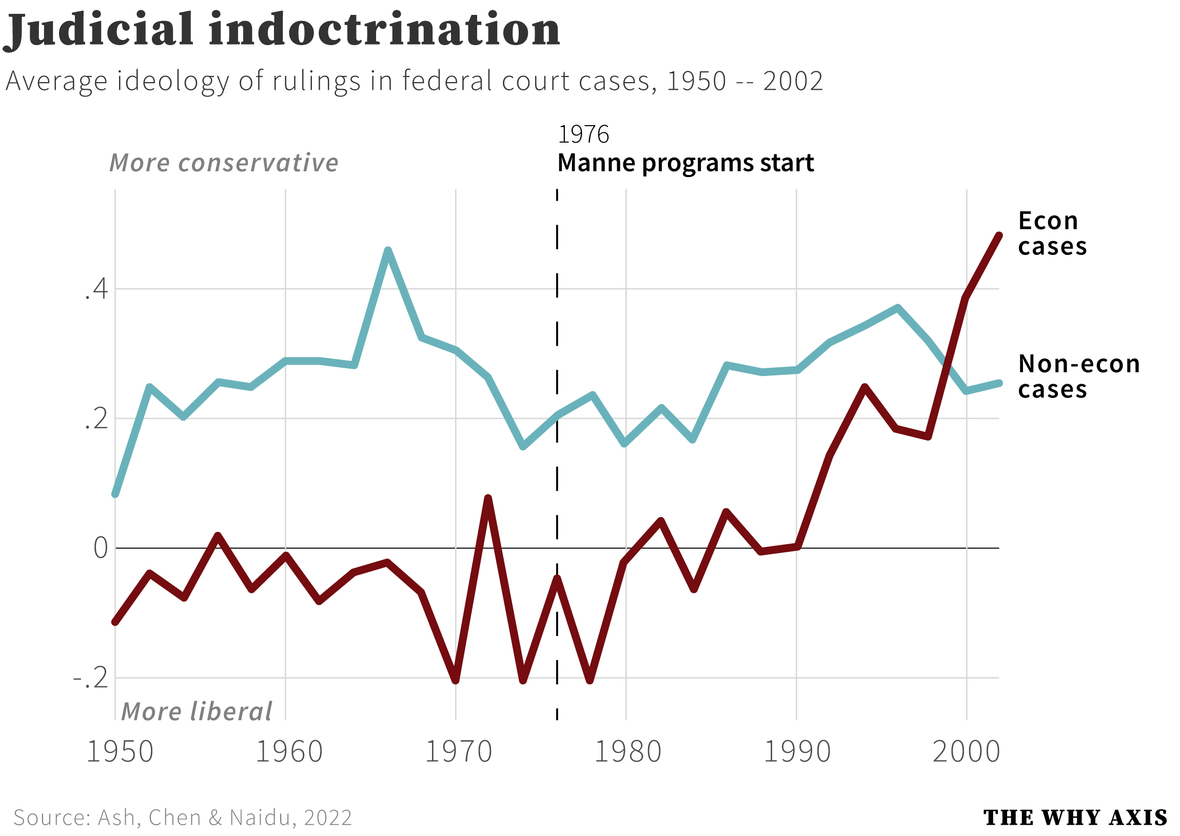 Now, new research quantifies those funders’ remarkable return on their investment: between the late 1970s and early 2000s federal court rulings on economic issues lurched dramatically to the right. According to the researchers’ estimates, the Manne seminars alone may account for a third, or more, of the rise in economic judicial conservatism in recent decades.