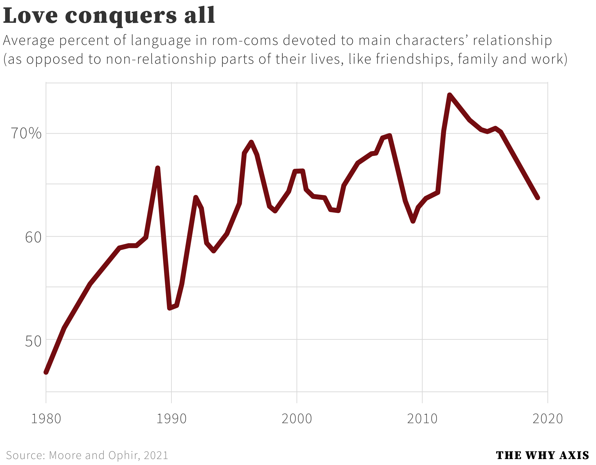 They found, first of all, that since 1980 rom-coms have been putting more and more emphasis on the rom: the proportion of the average rom-com script focused solely on the relationship between the two leads (as opposed to work, friends, and other non-relationship parts of their lives) is growing considerably.