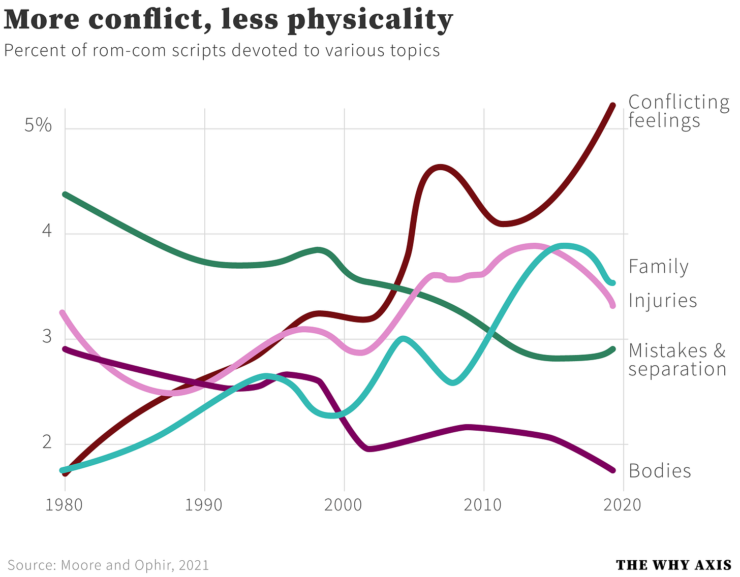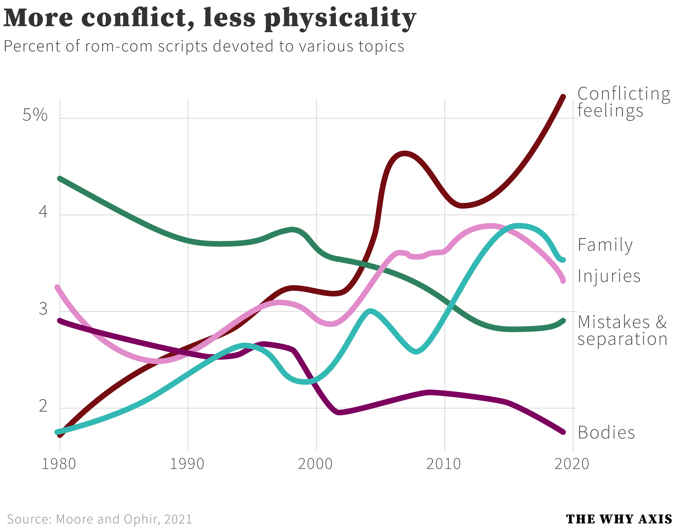 One open question is whether and how much the thematic changes identified in rom-com scripts are a function in industry-wide shifts in how films are written and produced. Conflict, after all, is a key element of any good movie plot. Producers and studios could be increasingly demanding scripts with sharper conflicts across the board. Moore notes that in general, films with a greater emphasis on romantic relationships do better at the box office.