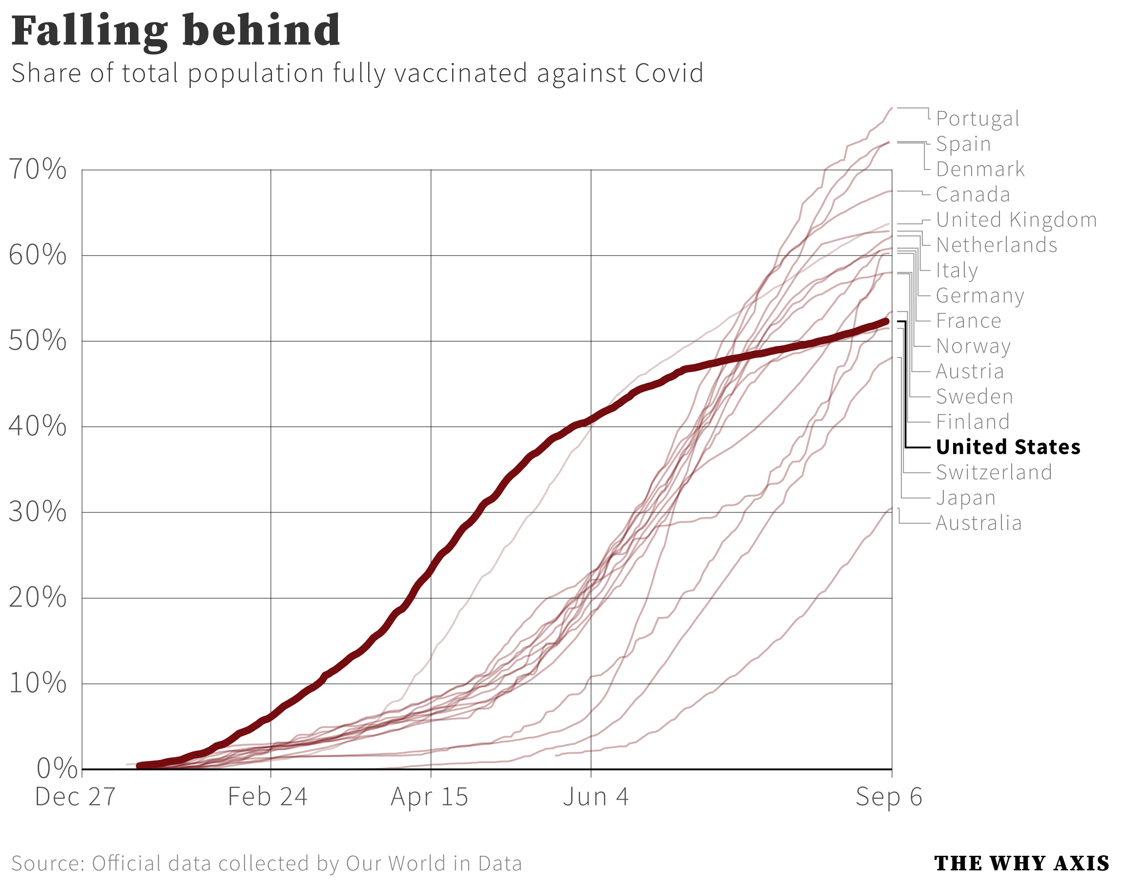 The rapid development and rollout of the Covid vaccine in the United States was nothing short of miraculous. For the first half of 2021, vaccination rates in the United States were higher than in just about any other wealthy nation in the world — a fact which informed a lot of press coverage of the pandemic at the time.