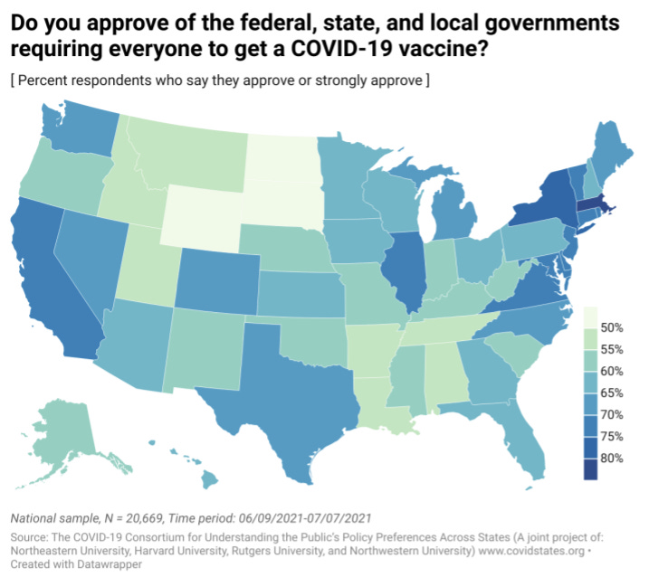 They found, moreover, majority support for a universal vaccine mandate in all but three states — Wyoming, with 46 percent, and the Dakotas, where support hovered right around 50 percent.