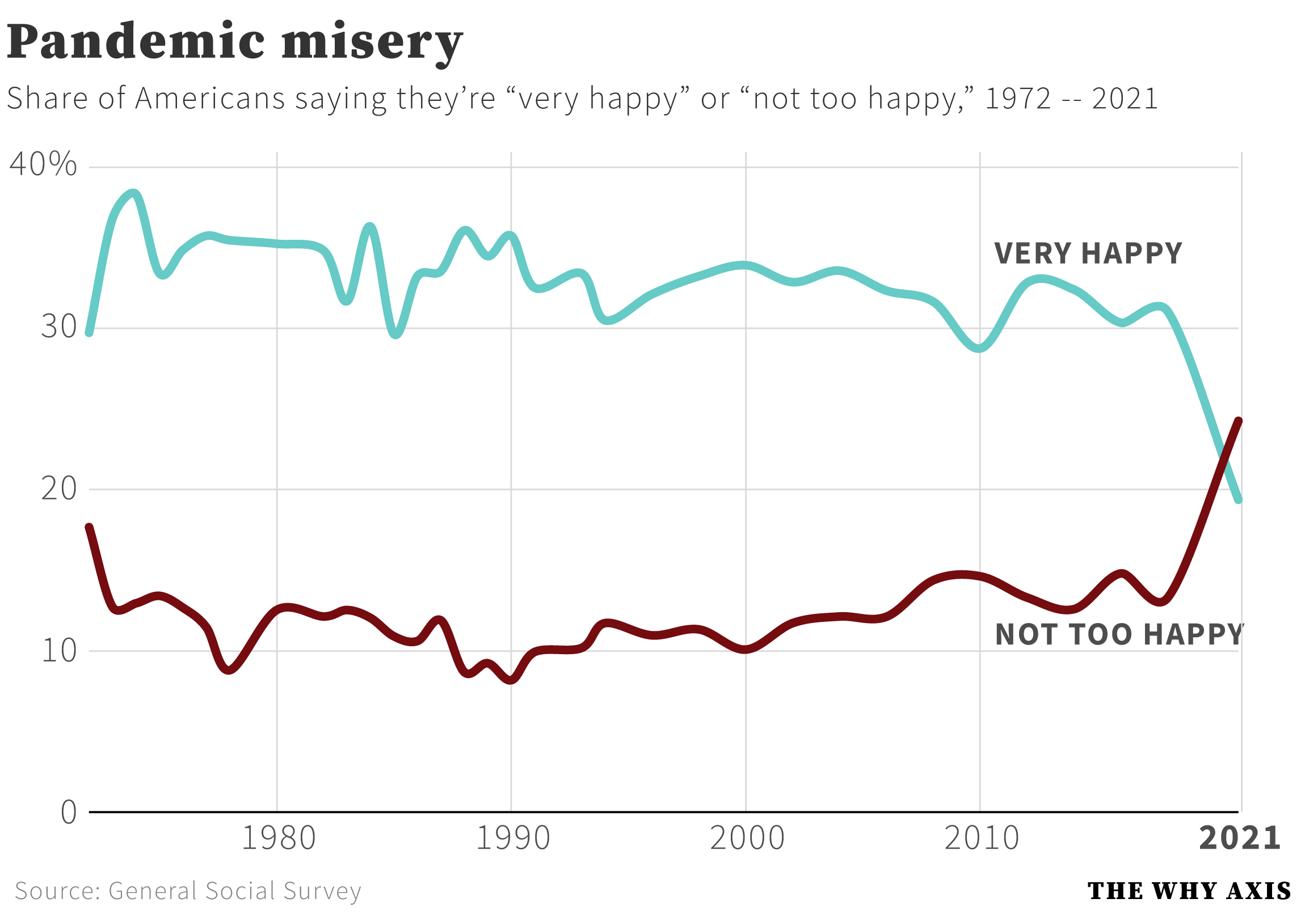 For the first time in polling history, in other words, Americans are more likely to say they’re not happy than to say they’re very happy. The obvious driver of this is the pandemic. In 2021 happiness took a major hit across the board — Democrats and Republicans, men and women, rich and poor, healthy and unhealthy people — all reported a decline in the quality of their life.