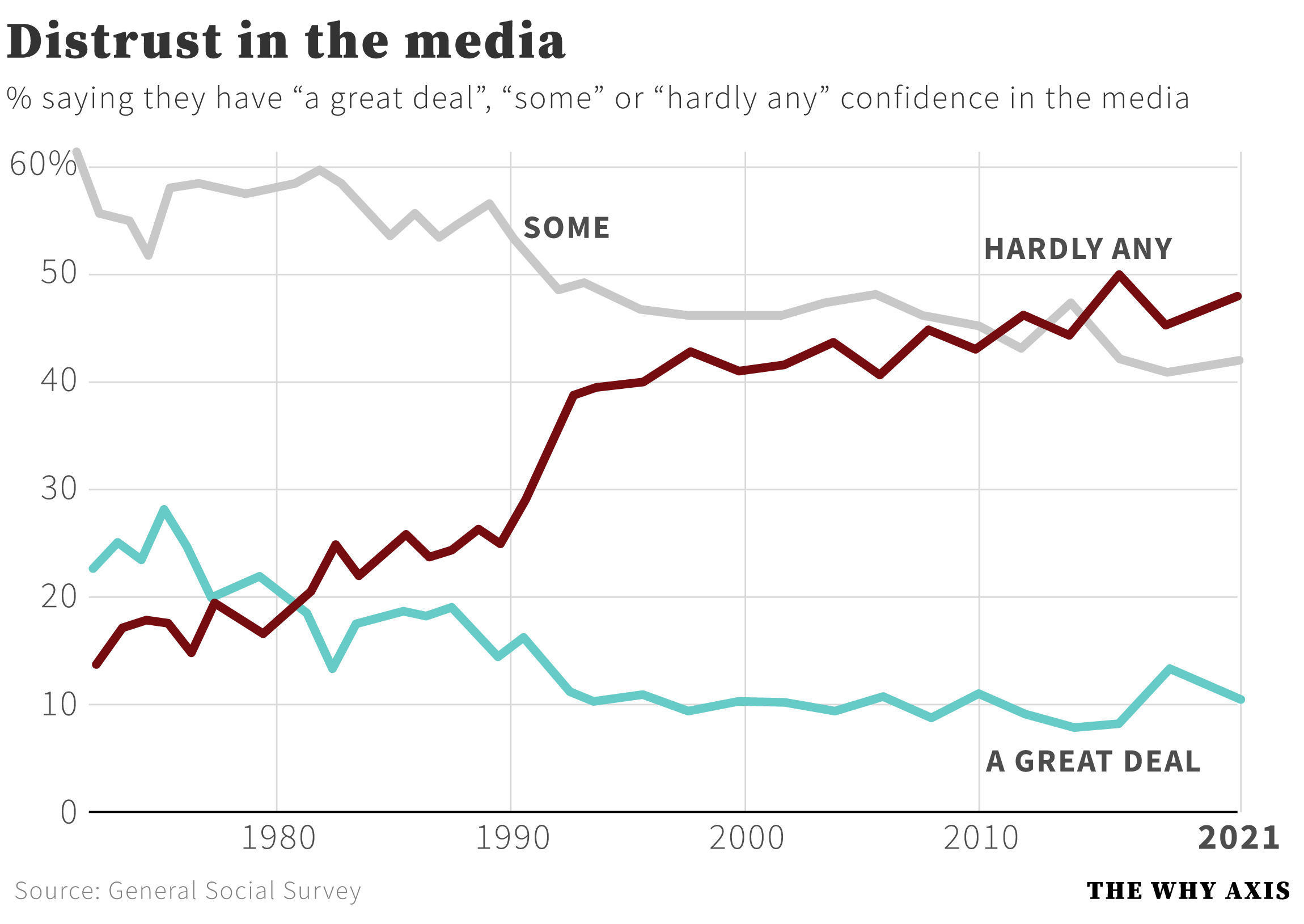 Indeed, the latest data on trust in the media, released last week by the General Social Survey, paints a dire picture. Confidence in the press continues to erode, with those saying they have “hardly any” trust now outnumbering those with “a great deal” of it by roughly five to one. An additional 40 percent of respondents say they have “some” trust.