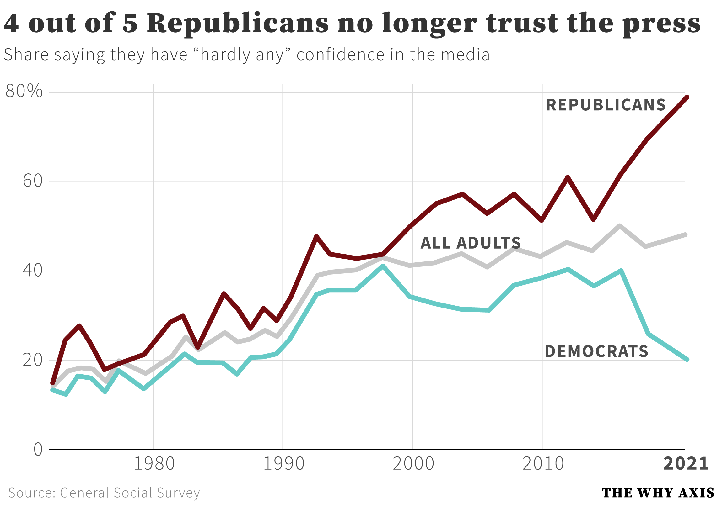 It wasn’t always this way. Back at the dawn of the 1980s most people said they had “some” trust, while those reporting a great deal of trust still outnumbered the doubters. But over the subsequent decades those numbers began to shift. The story of declining faith in the media is a well-known one at this point. It was driven in large part by the rise of a partisan conservative media, including talk radio and Fox News, that worked relentlessly to discredit mainstream press reports that undermined conservative orthodoxy. These efforts were abetted by conservative politicians who quickly realized that sowing distrust in the press was an effective way to neutralize negative coverage.